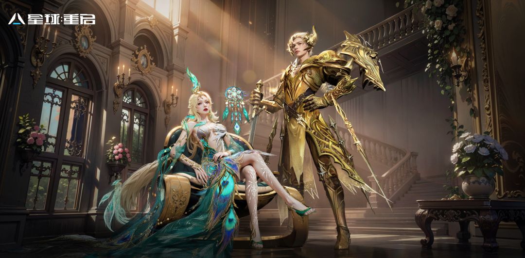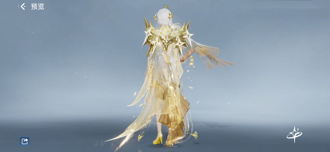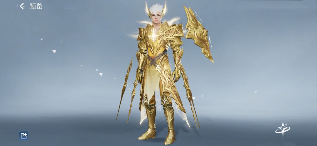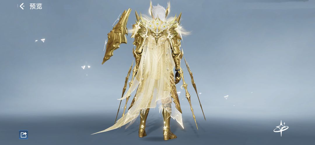 男款棱角分明的设计仿佛战神亲临,一袭耀眼金铠,纹路精致繁复,厚重肩部与夸张胸部铠甲,尽显力量与威严。四周悬浮着剑武,再配上那自带气场的尖角头饰,妥妥的宇宙霸主既视感。