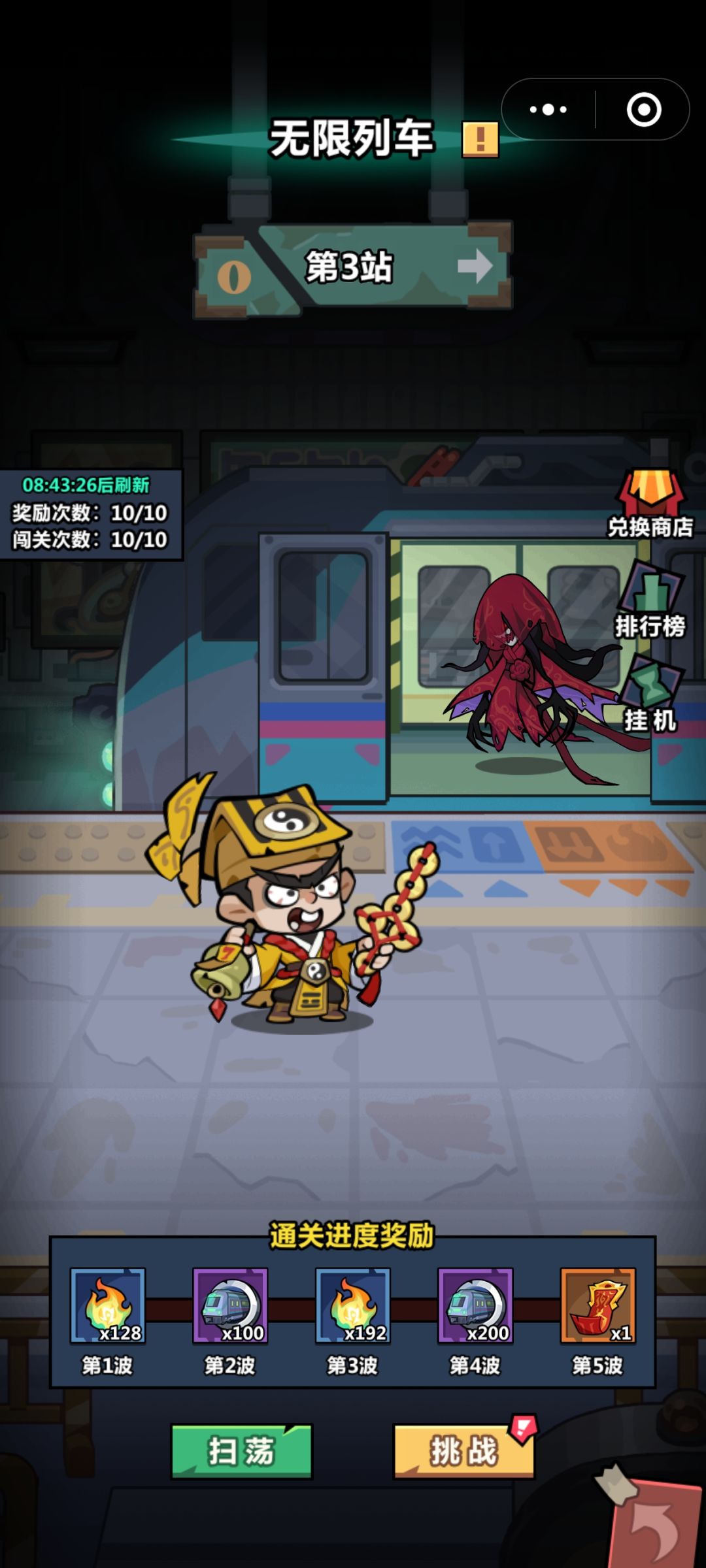 副本-无限列车,模式类似于冲层挑战,可以获取抽奖券吗,列车币等物质,列车币可以用于兑换奖励,与主模式一样,需要携带5位神将,然后进行防守5波。在游戏开始前,可以选择5次神将升级&法宝升级,每一次可以选择两个效果,全部选择完毕后,就会面对5波怪物!