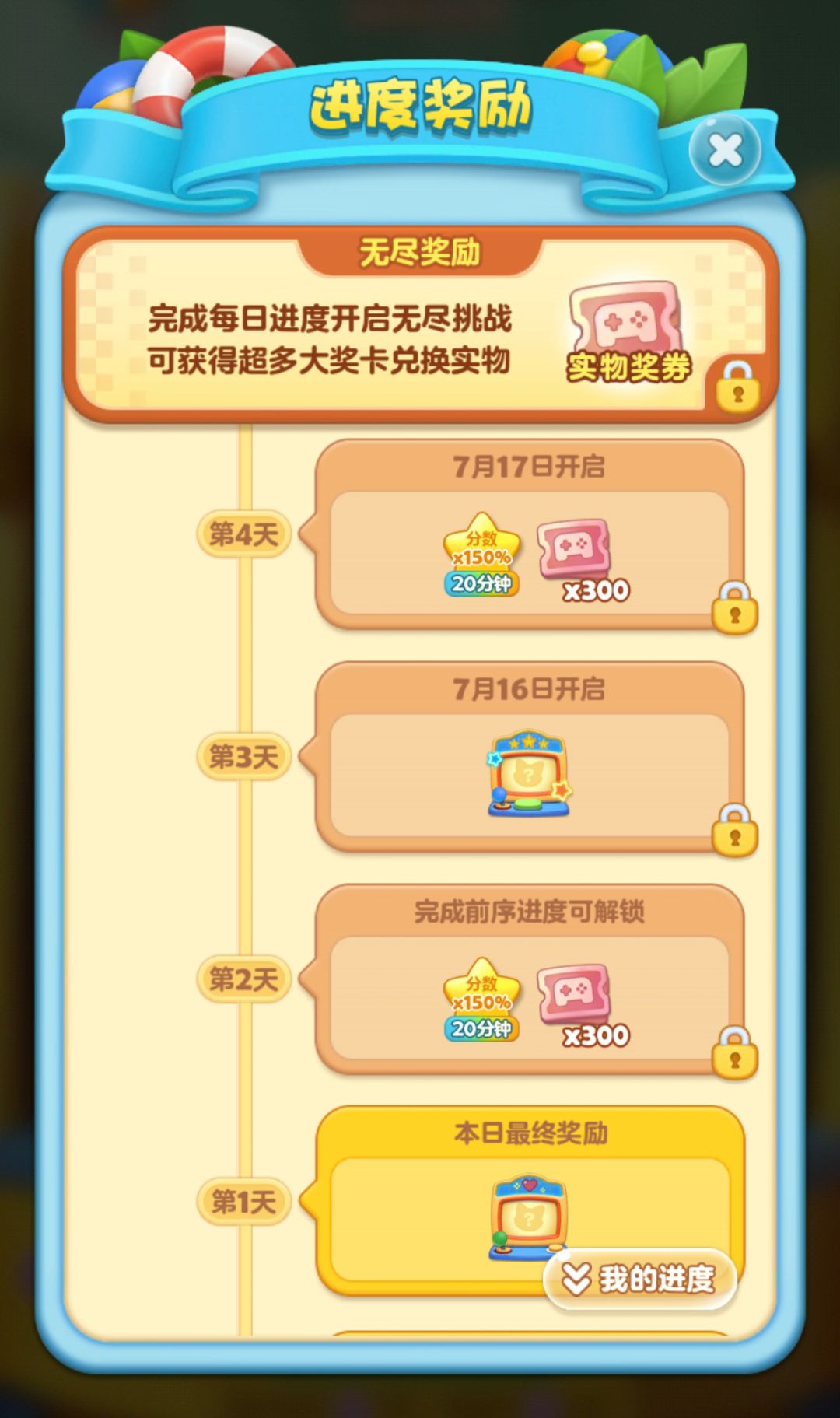 积攒活动积分可领取进度奖励,包含大奖卡、闯关道具、头像框装扮奖励等丰富内容;完成每日10个进度任务后将开启无尽挑战,可获得超多大奖卡!