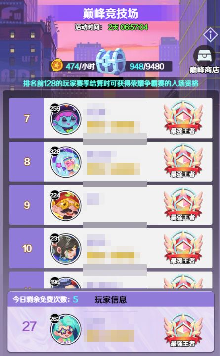 1.巅峰竞技场每2周一个赛季,采用段位制。根据玩家排名分为青铜到最强王者7个段位。