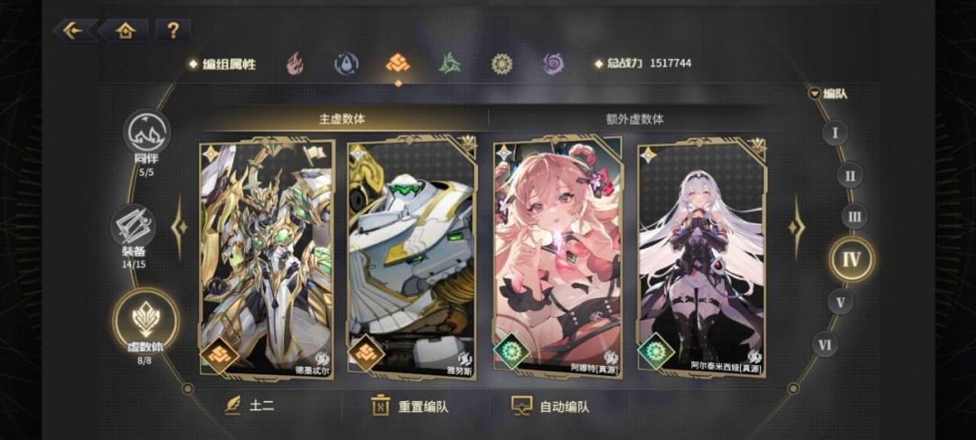 后三位主虚数体可以提供非主位加护效果且战斗中可以发动虚数降临效果,会提供初始能量。最优选为阿娜特、米娅、雅努斯,次选嫦娥、格拉夏·守护模式、喀戎AI,也可以根据副本需要选择带驱散、推条、回血、护盾、净化、免疫等功能的虚数体,其中阿娜特、米娅、雅努斯、嫦娥可以通过卡池抽取或12星花币兑换,格拉夏守护模式可以通过攻略福音格拉拉兑换(目前活动已结束),喀戎AI可以通过完成进阶任务获取。