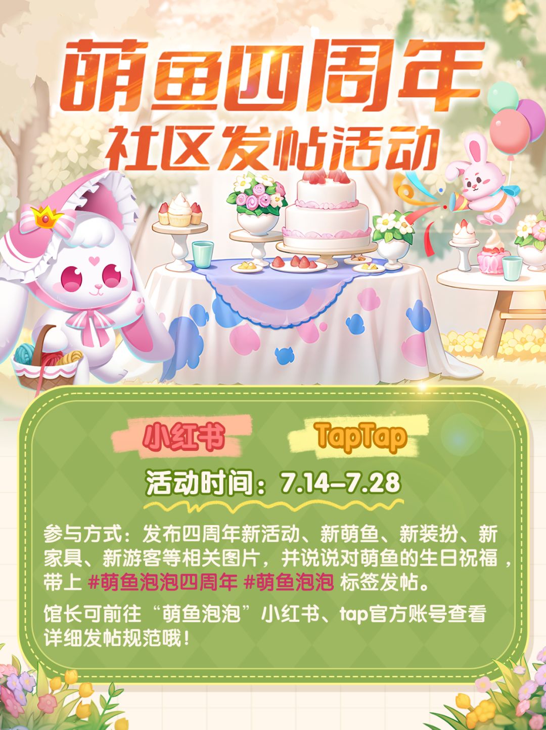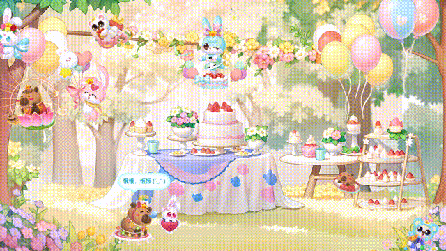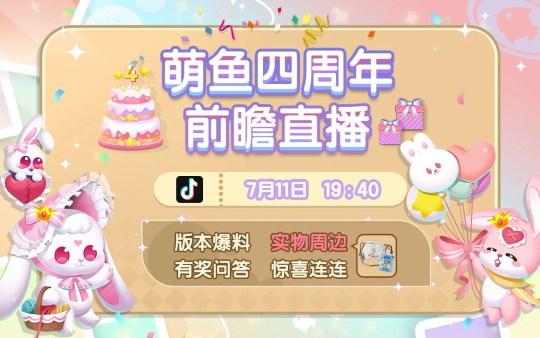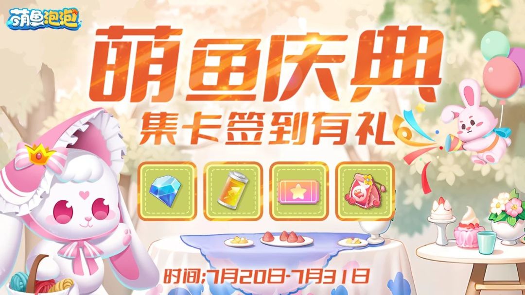 7月14-28日开启周年庆典,新萌鱼吱吱兔及变异萌鱼准时到达派对现场,花环、气球、彩带已备齐气氛到位,庆生开始~