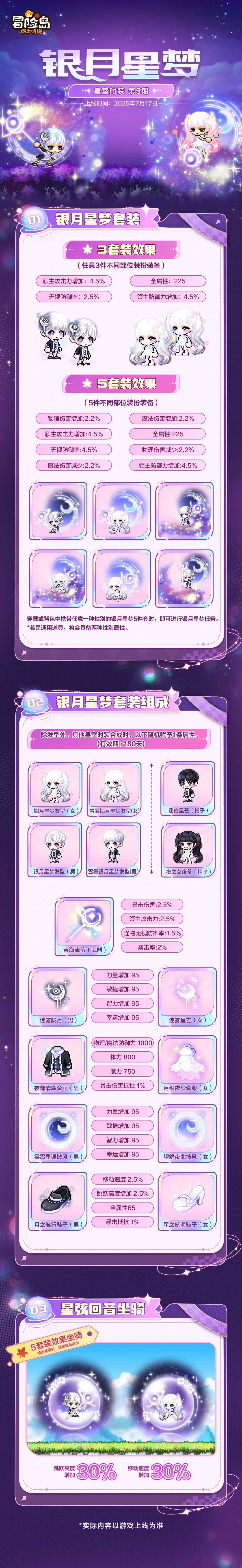 本期「银月星梦」时装包含同系列外观五件套、发型、帽子等配套单品。同时保留除发型外,其他皇室时装合成时,将随机赋予1条额外属性,期待值拉满!