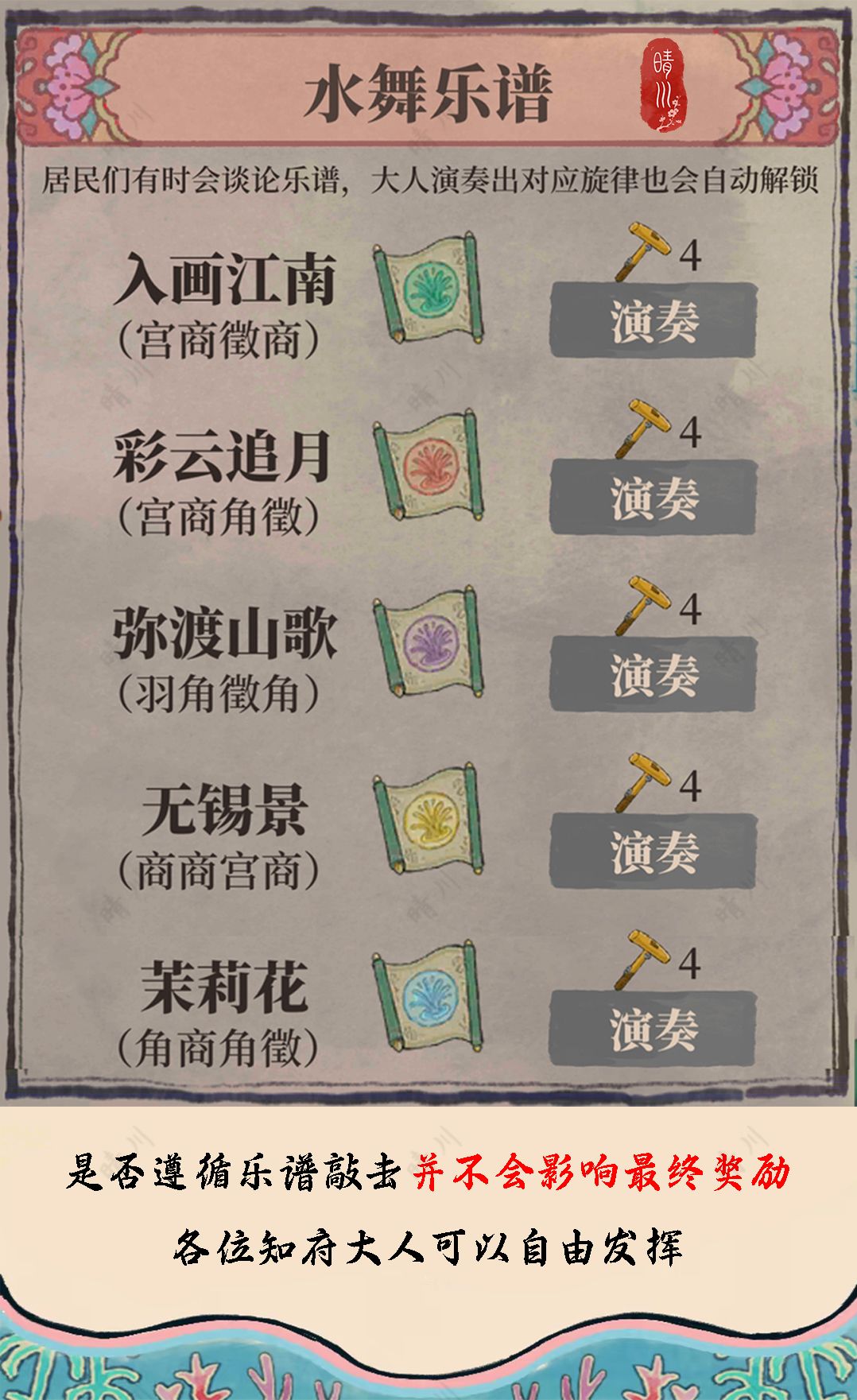 水舞乐谱:是否遵循乐谱敲击不会影响最终奖励,各位知府大人可以自由发挥