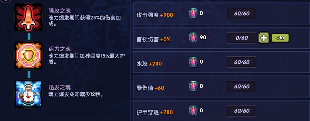 加减时间可以自己进行尝试,不同打法/通关时间适合的魂力都会有所不同