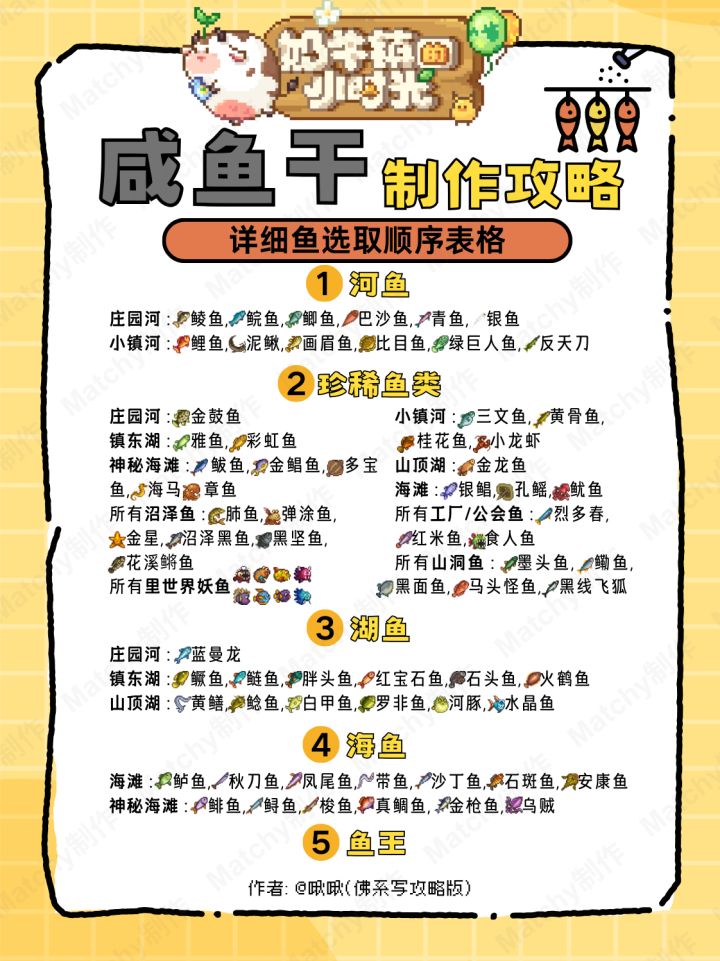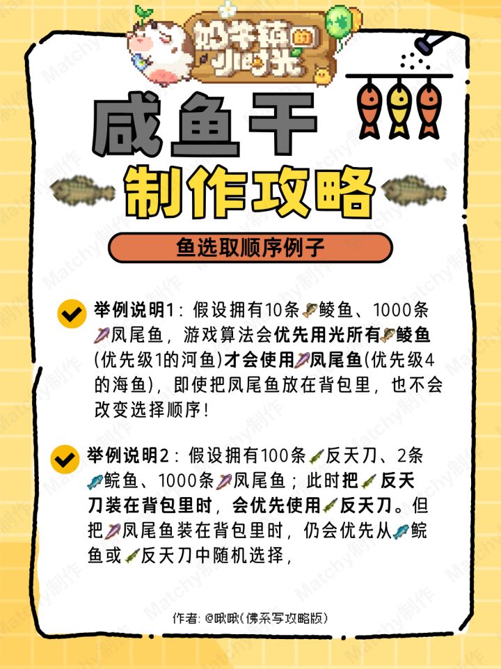 制作咸鱼干时理论上可以使用任何鱼,但选择鱼时有优先级顺序,游戏算法会用光所有的高优先级鱼之后才使用下一优先级。如果想要用下一优先级的鱼,必须把所有前一优先级的鱼全部销毁或全部放进出货箱才行。