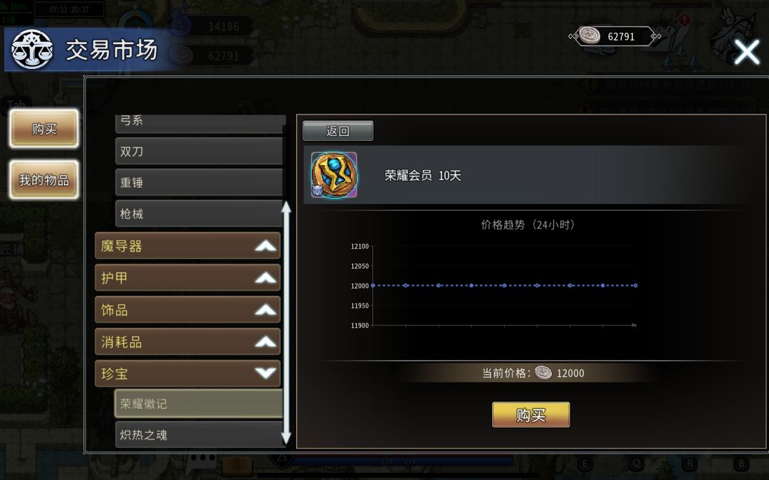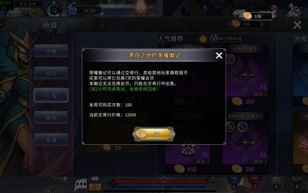 商城珍宝,金币购买荣耀徽记,挂交易行后,2小时必定会售出,且没有手续费。