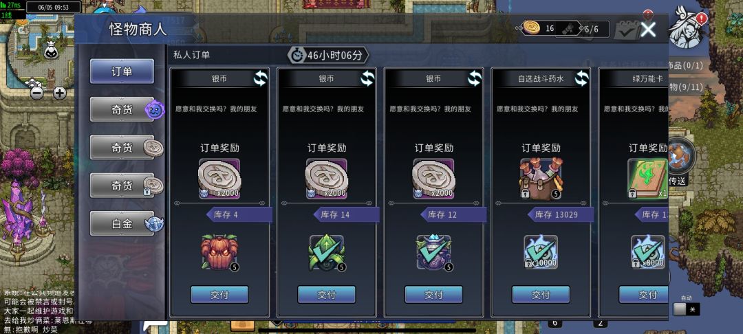 有概率刷出果子(非绑定),灵魂之尘,紫结晶换银币的订单