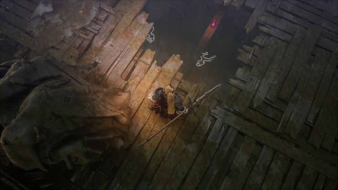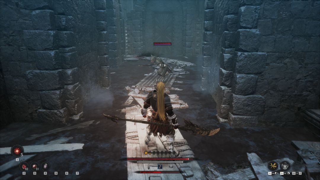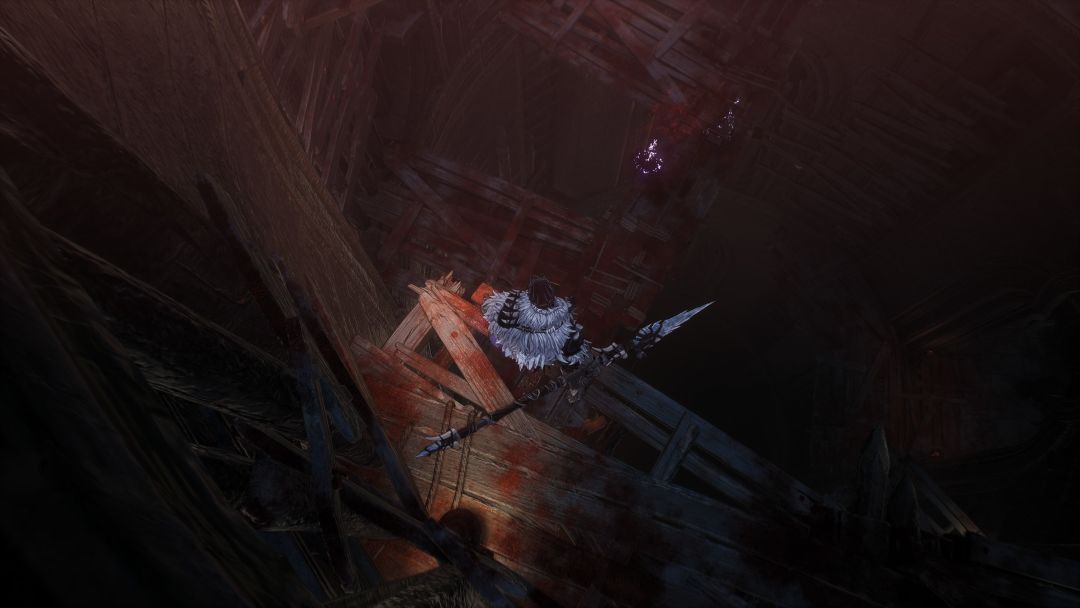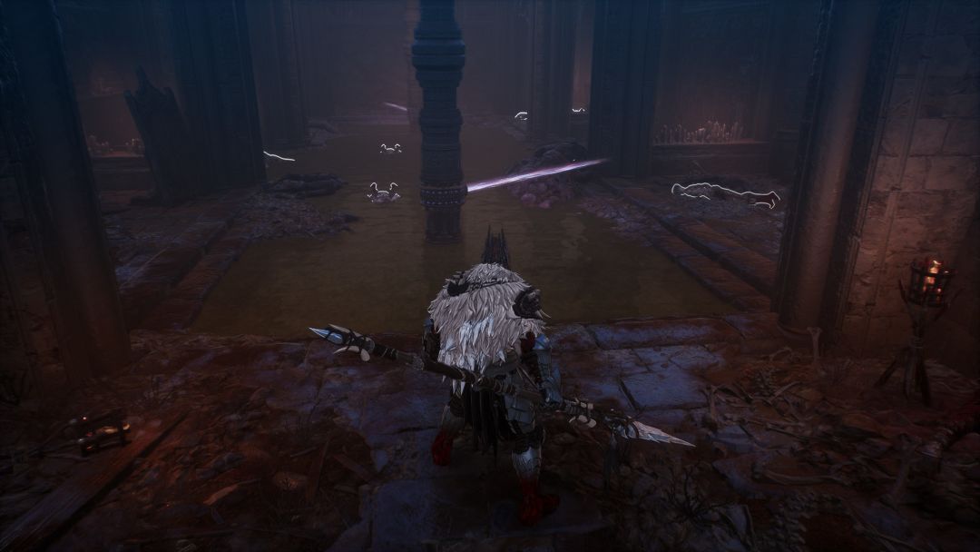 然后是【粪坑蝶泳】,众所周知,从《黑暗之魂1》开始,“粪坑”之所以恶心,就因为它往往还搭配怪物,配合避无可避、给你持续叠状态(一般是中毒)的毒池,和所剩无几的血瓶、不知道在哪的下一处篝火,带来一种抓心的焦虑感。《第一狂战士卡赞》也很少会有单纯的“粪坑”,标配怪物是常态,此外还经常有大量的陷阱。