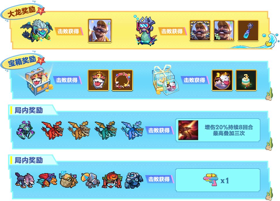 ● 气泡有不同“层数”(1-3层),被对应技能击中减少1层。层数归零即消失,奖励到手!● 每轮气泡全部击破,自动刷新下一轮气泡,奖励预览如下: