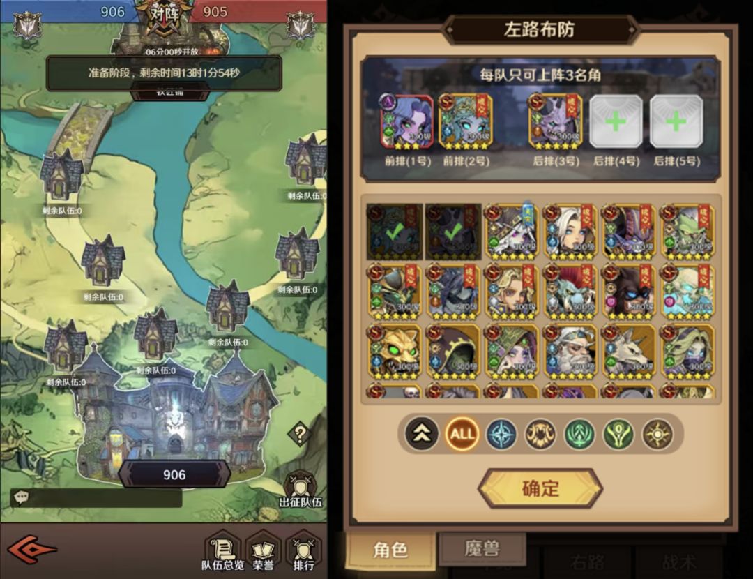 在匹配到敌方公会后进入战场布置出征队伍,玩家可在战场中左、中、右三条线路以及在“战术”中分别布阵1支队伍,每支队伍最多只能分别上阵3名不可重复的角色和宠物。