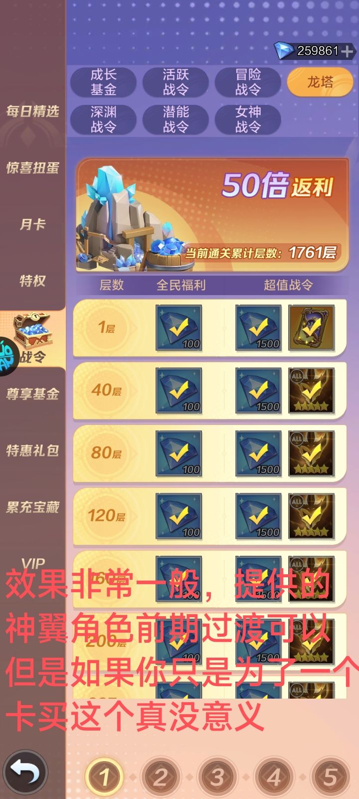 (3)龙塔战令:没有任何意义,开局的神翼自选,其实效果提升并不大,花68买这个不如买作战特权(更何况还有珍享特权)