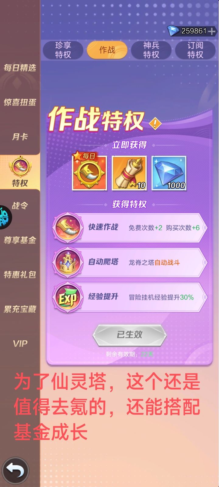 毕竟如今买这个特权也就是为了后续的仙灵塔排行榜争锋,所以在必要情况下完全可以买一下,拿排行低保奖励。