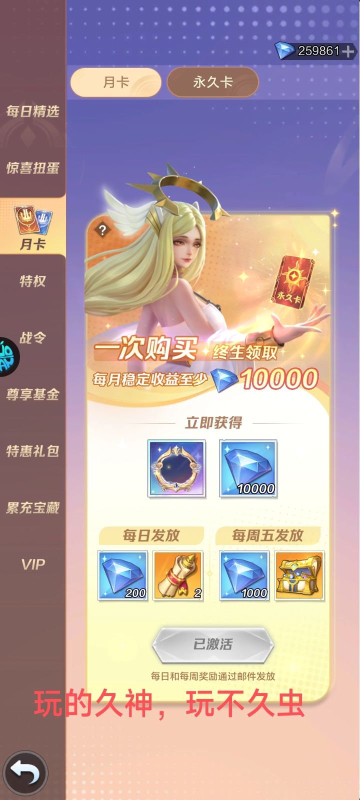 (4)永久卡:这是一把双刃剑的特权,毕竟你想回本就要坚持玩下去,所以如果不坚持的人就不要买。