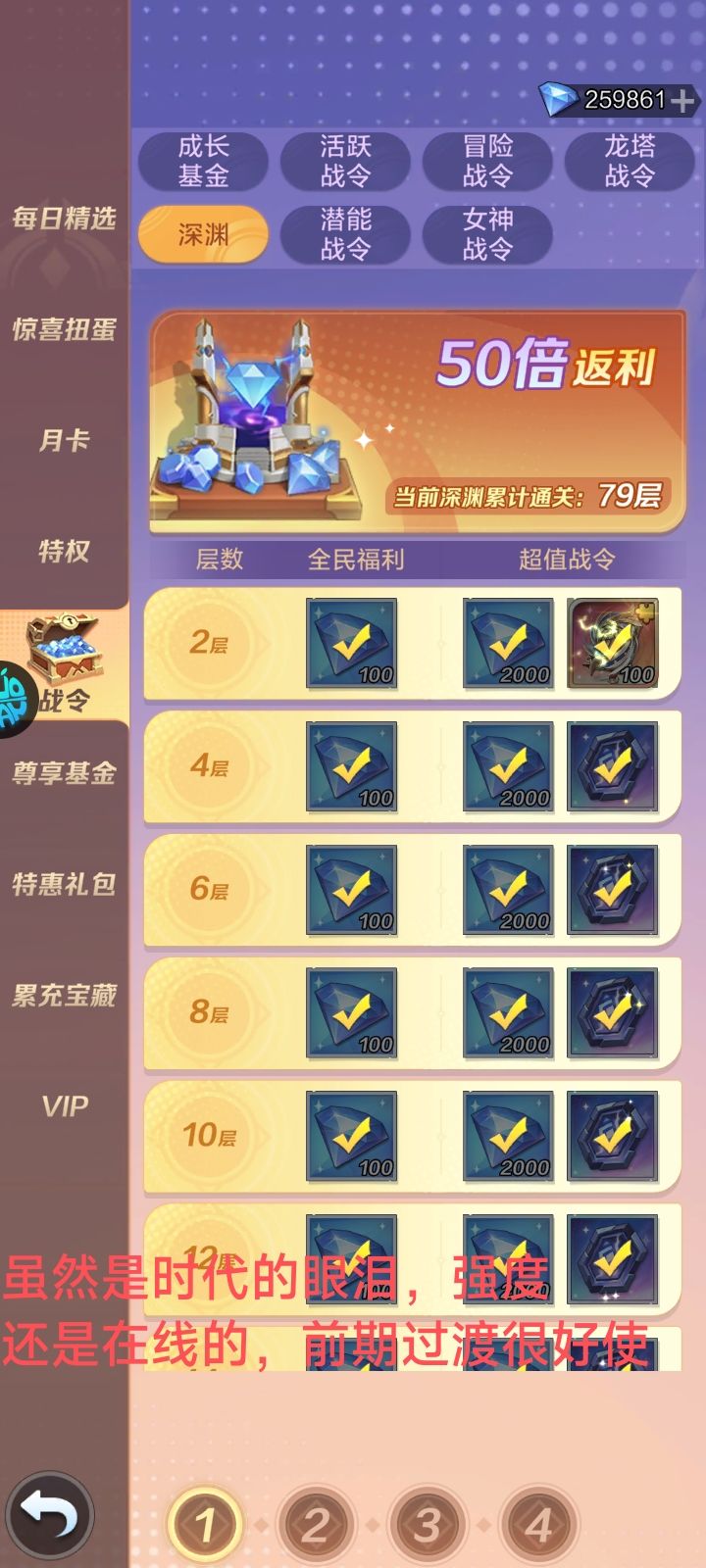 (2)珍享特权:此特权在第四天开启记住,第四天一起开启的有深渊战令(这个后面讲)