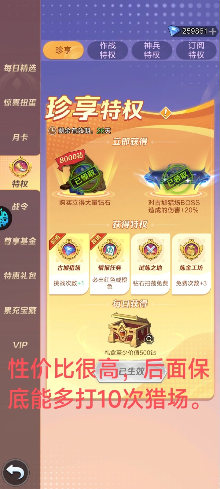 珍享特权能够稳定的提供一个月之内领主boss多掉一次钻石的收益,加上刚买立即返钻石8800 钻石也是特权中唯一不错的选择。