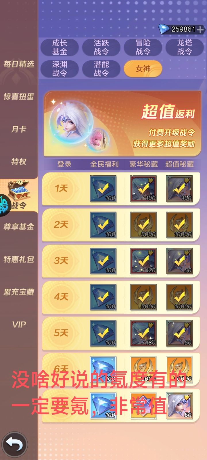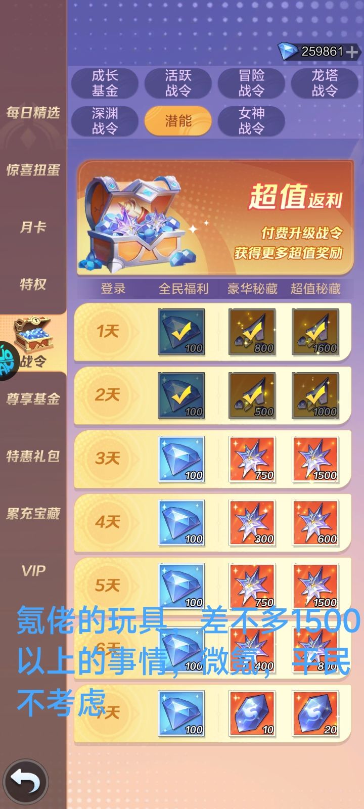 (5)潜能战令:这个属于后面开启的战令,很划算,不过只限中氪以上,微氪,低氪不考虑。