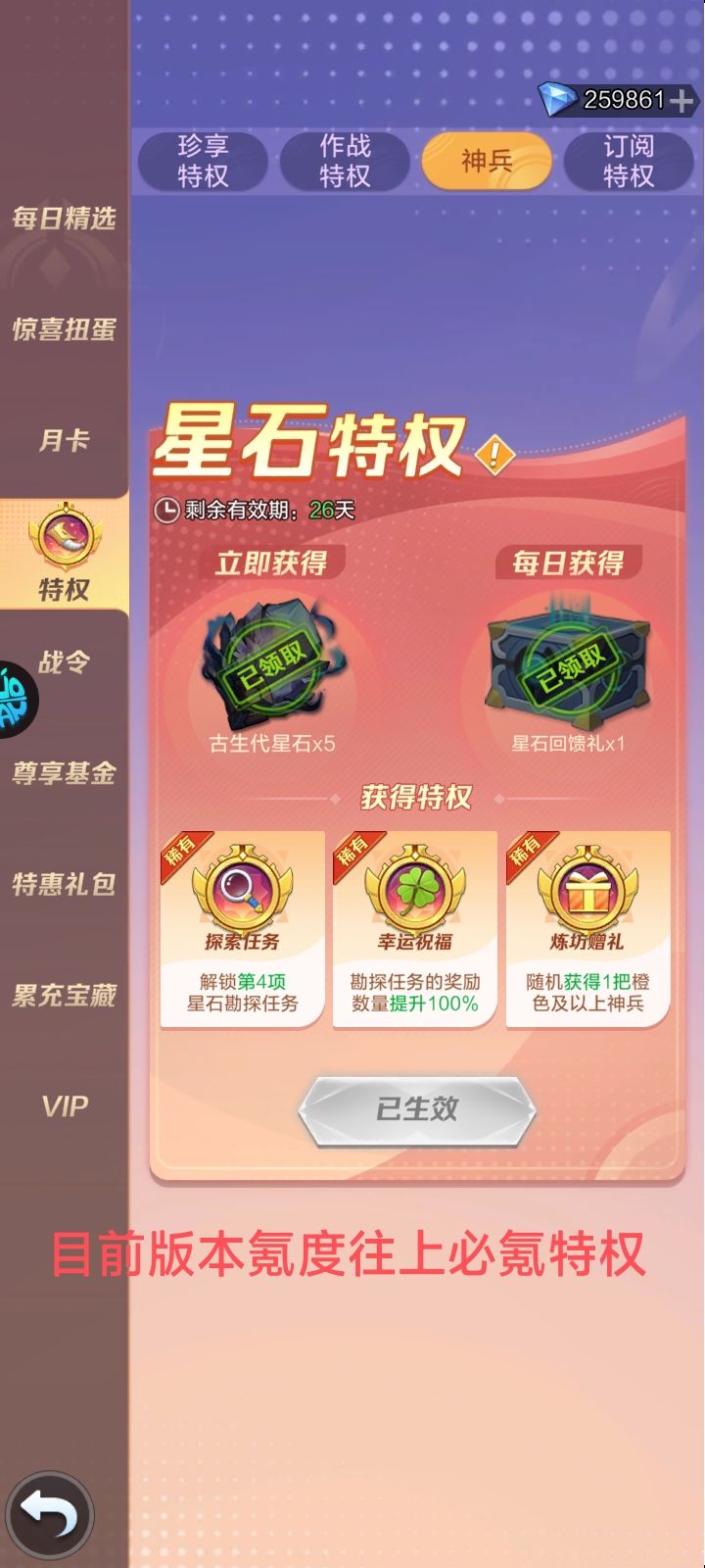 (1)星石特权:现在神兵特权更新,基本上稳定一个月拿到心愿神兵,大大提高了后期神兵的稳定性