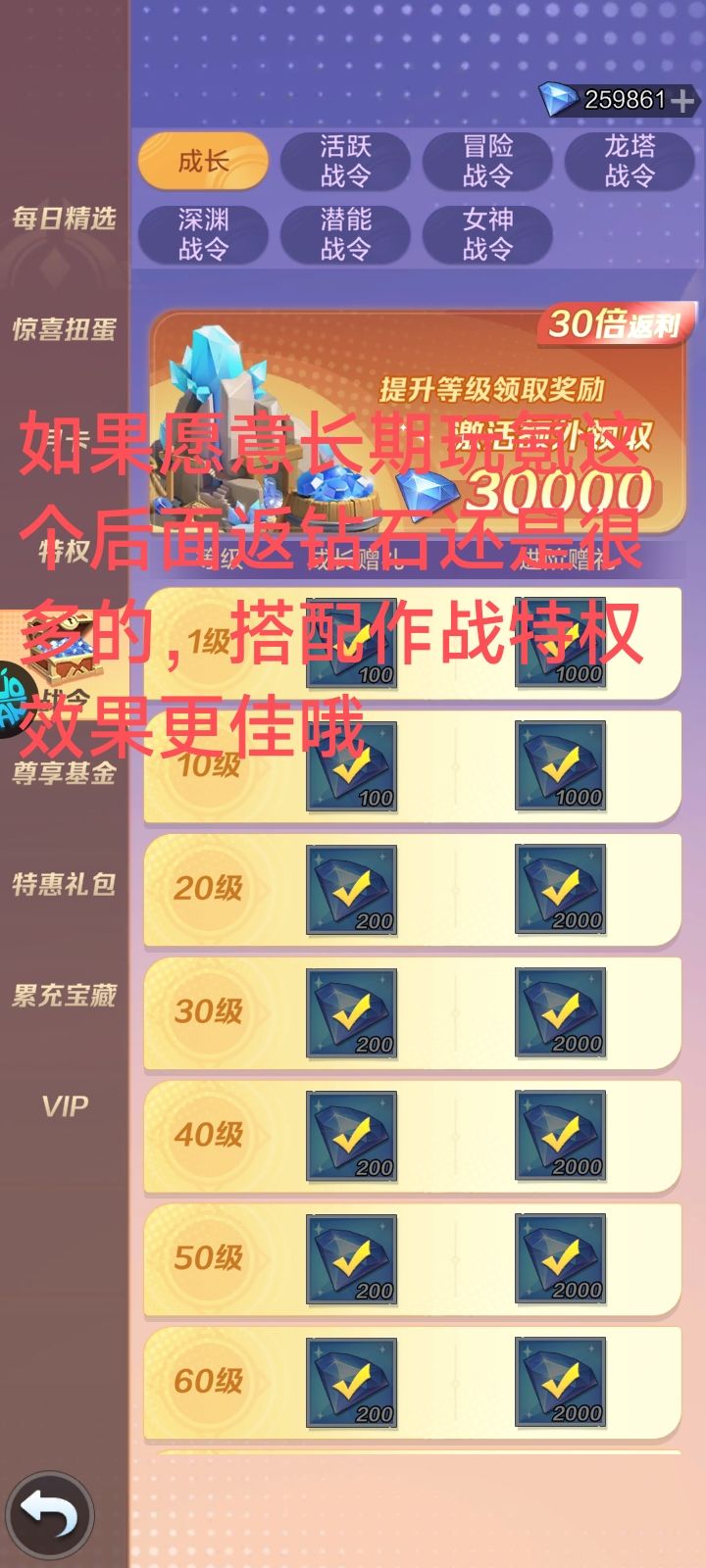 (6)成长战令:这个是一把双刃剑,玩的久可以考虑买一手,后期的大量钻石都是不错的选择,但玩不久等于吃灰。
