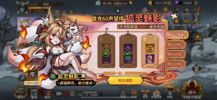 1、可以考虑首冲6元送的狐灵魅影-阿离,加上升级和登录及游戏送的各种福利,很容易升6星的,前期可以当做主C。