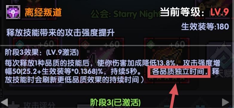 每释放1种品质技能,使伤害加成降低13.8%,攻击强度增幅50%,持续5秒(各品质独立时间,释放技能时会刷新更低品质效果的时间)