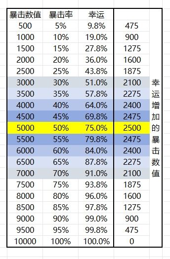 当50%暴击时, 暴击幸运词条收益达到最大值,