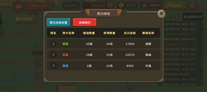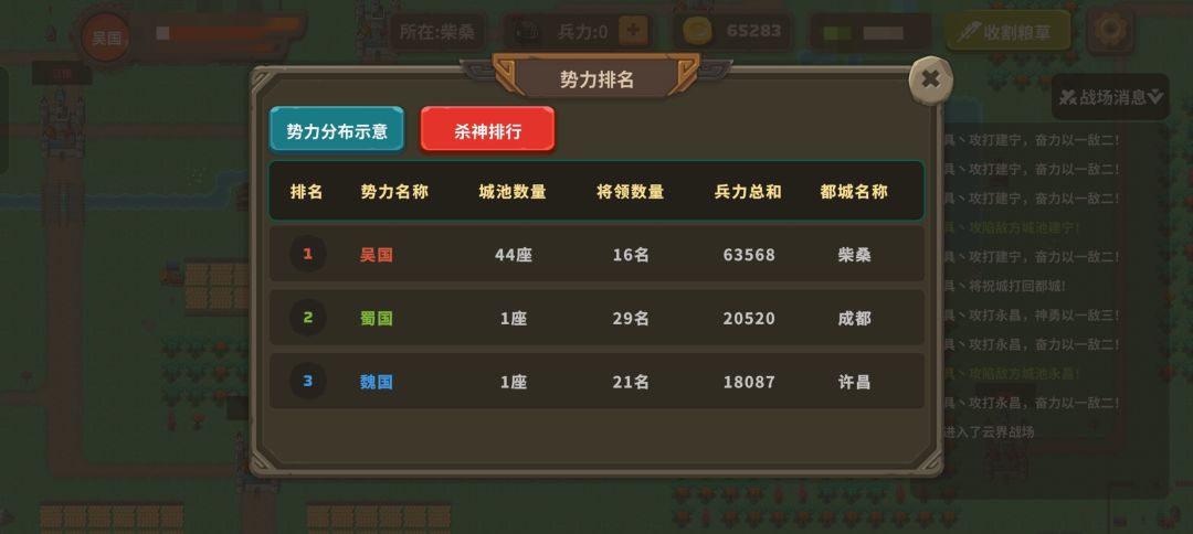 三国鼎立,但吴军可谓是十分勇猛,前几日奠定优势。随后某天夜里蜀国异军突起,梦醒大将和先锋密谋反抗,吹响战斗的号角,直接拿下了大片领土,为蜀国重新取得优势。蜀军连拔数座城池后,没想到粮草开始供给不足……