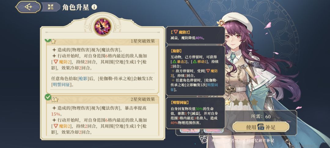 首先这是妹妹的个性介绍,简单的说2星增加暴击,3星增加移动,4星增加潜能激发,5星增加技能冷却。