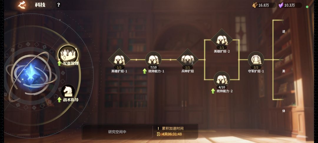 前期科技加速时间我建议可以优先进行驻点军团的科技需求进行升级,因为我们前期无论是防御黑翼军团还是副本都是需要军团的强度,后期再根据需要进行其他方面的加速升级。