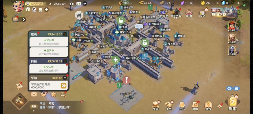 除了主城建设资源需要合理规划以外,还有一些其他资源同样需要进行规划(建筑,科技加速时间,慧晶,粮食,智慧龙鳞,)
