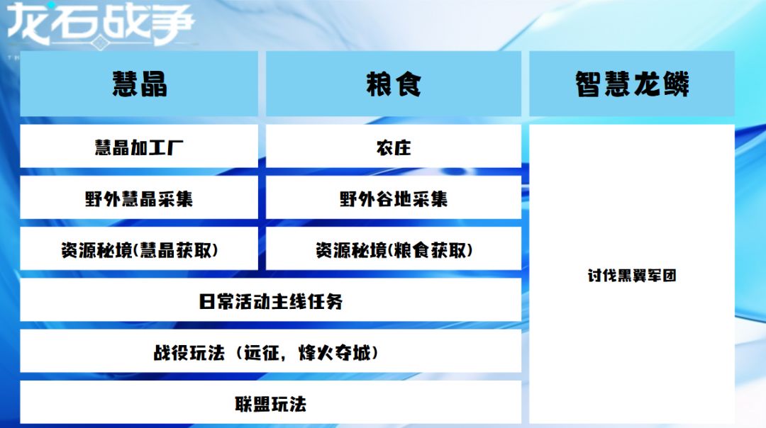 首先我们先俩了解一下这三个资源的作用慧晶:科技研究和训练士兵的材料。粮食:生产军饷的材料。智慧龙鳞:英雄升级材料。同样是一张图带大家了解这些资源的获取途径: