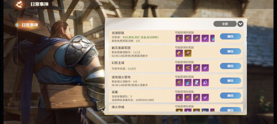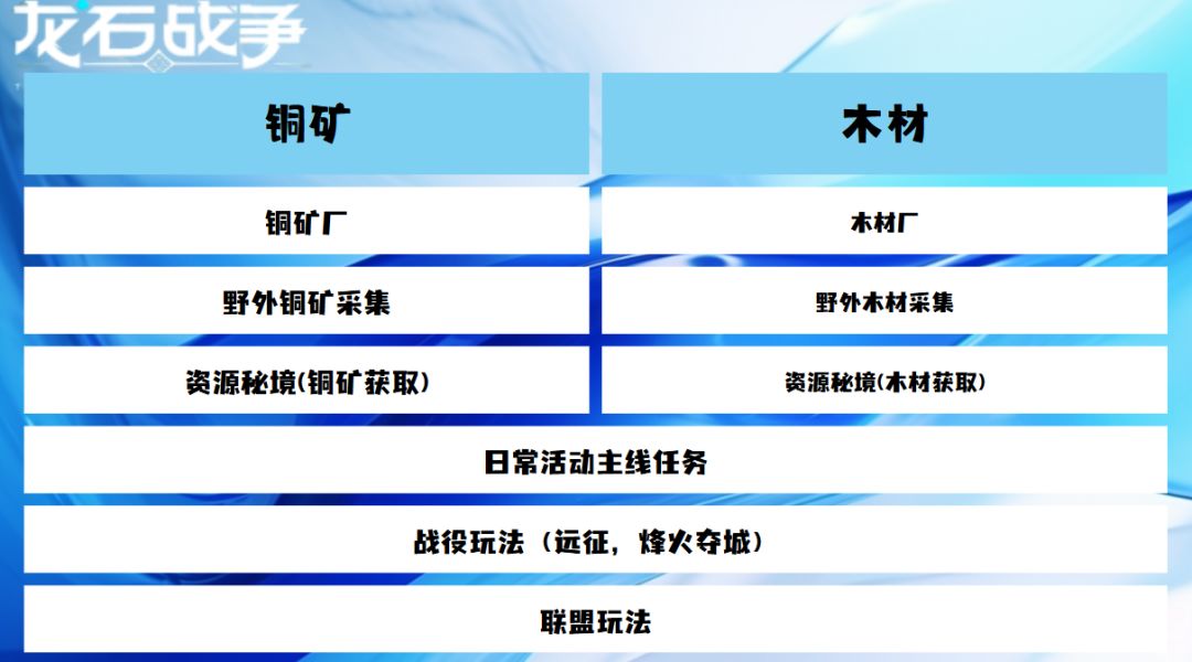 以上途径除了铜矿厂,木材厂的获取方法外都可以在日常事项中一键跳转。