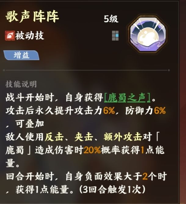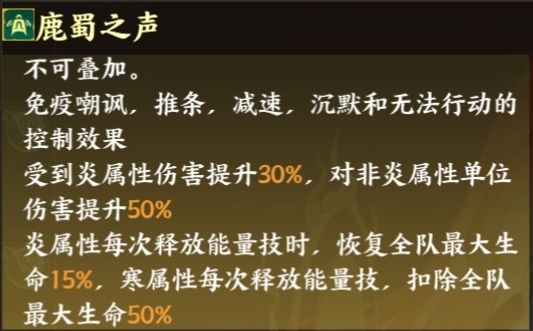 被动技,主要还是看这个鹿蜀之声,炎属性释放能量技就能回血,所以我们就可以多上阵几个炎属性角色来保证我们的生存,注意不能上阵寒属性,要不然放技能就会掉血。