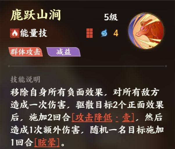 能量技,aoe技能附加2回合攻击降低,并随机晕眩一名敌人。