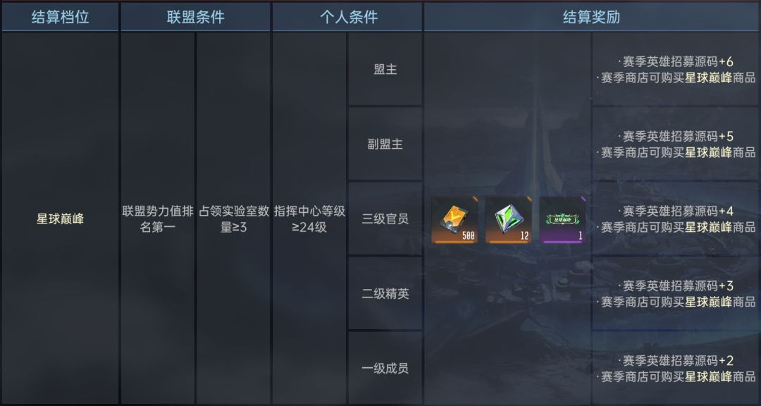 星球巅峰:最高档位联盟奖励,需满足联盟势力值第一,且占领3座以上6级实验室。