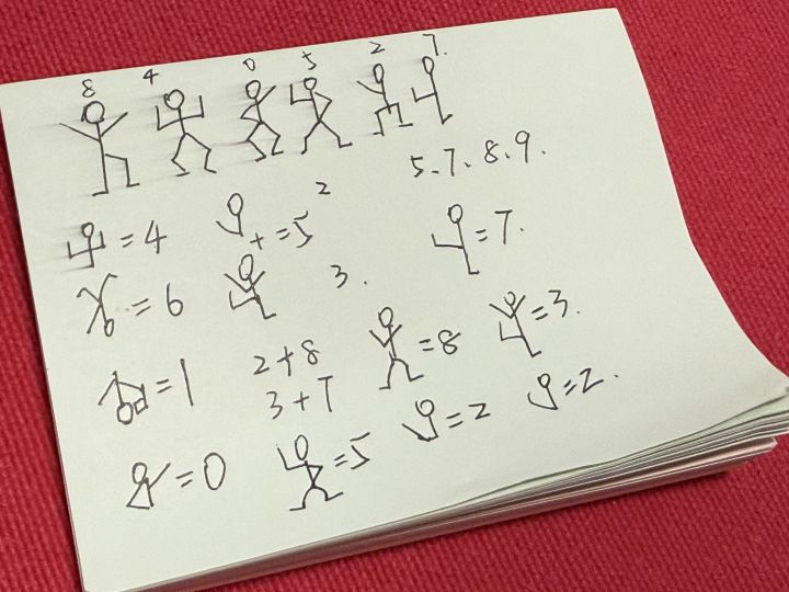 列出剩余数字,结合图4可估出重复的小人为5,将已知数字带入,可得其他小人之和为5。