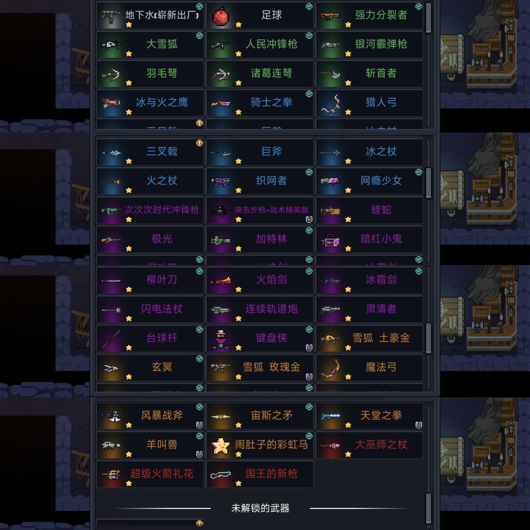 【远程武器】——【足球*】【强力分裂者*】【银河霰弹枪】【骑士之拳*】【巫师法杖】【织网者*】【次次次时代冲锋枪】【加特林*】【暗红小鬼】【闪电法杖】【雪狐土豪金】……