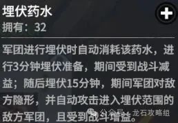 防守堡垒或者防守搬家点等位置时,可以使用埋伏药水,对队伍进行20分钟埋伏,开启埋伏后队伍可获得战斗增伤,也是关键战役中决胜的重要关键手段