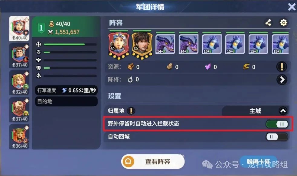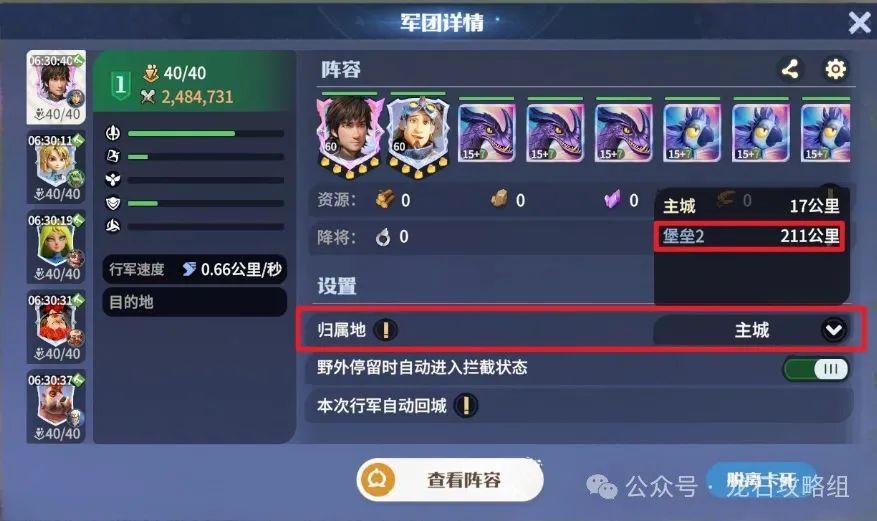 很多新手玩家建完堡垒后,队伍不会回堡垒,这时候需要进入军团详情界面手动调队伍归属地,让队伍能快速得到补给