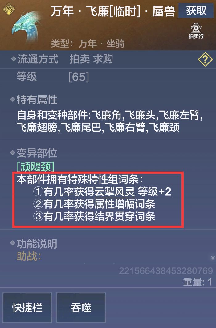 宠物可通过吞噬蜃兽临时卡来获取“特性词条”,特性词条最终生效的效果,由宠物身上所有变异部位携带的“同名特性词条”的等级之和决定。