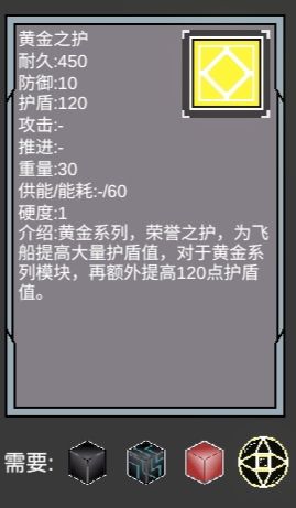 推荐使用黄金之护装甲,护盾类装甲可以有效保护核心,增强对完全穿透武器抗性,黄金系列额外护盾量能显著提升装甲部血量,而且高额护盾将原本脆弱的能源方块也能作为防御方块使用,例如上面的完整蓝图使用x能源方块作为前部装甲和侧面拦截导弹装甲