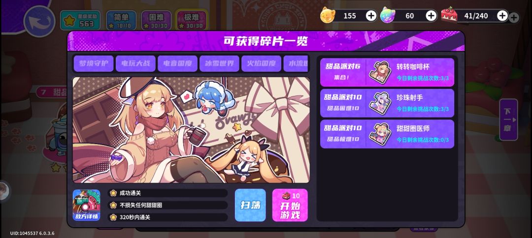 每个难度最后一关可以获得角色碎片,甜品电甜品店玩最高难度,刷完之后给的甜甜圈医师碎片和电玩碎片那两个每天拉满就行了,在前期先给主要的几个角色所需勋章刷好的情况下再去刷碎片