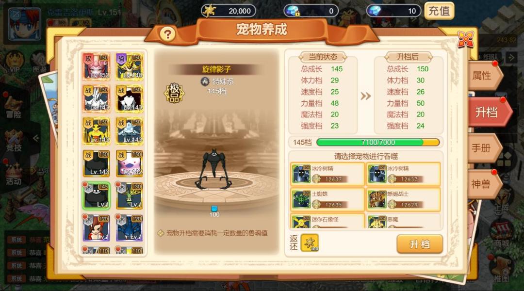 宠物最高150档,可以通过吞噬宠物给宠物升档,其中珍品以上宠物都可以通过吞噬提升到150档!前期别嫌弃 “低档位” 宠物,留着当升档 “狗粮”;主力宠物优先喂到满档,战力直接碾压同等级!