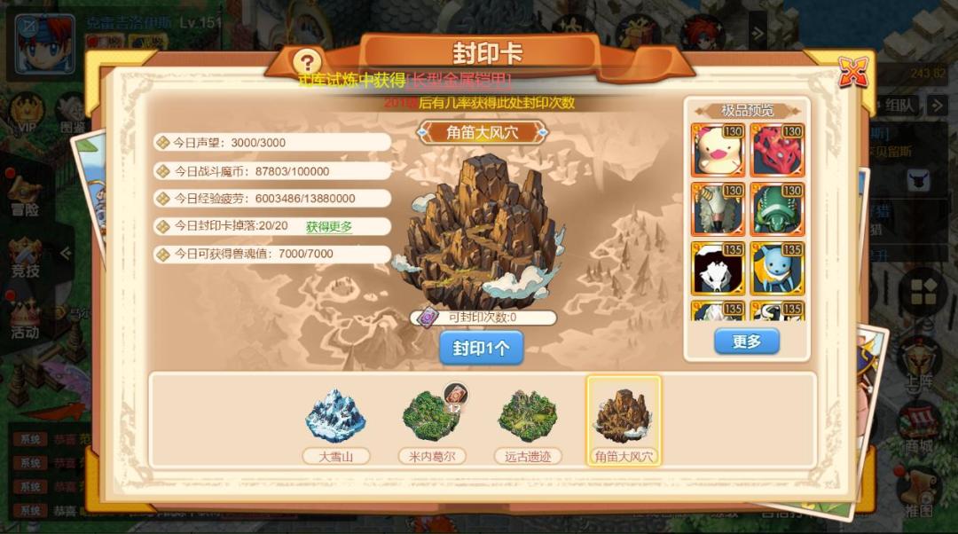 新版本宠物可通过封印卡来召唤宠物,封印卡以此分为:大雪山、米内葛尔、远古遗迹、角笛大风穴。其中大雪山和米内葛尔最高可获得珍品宠物,远古遗迹最高可获得极品宠物,角笛大风穴最高可获得王品宠物!