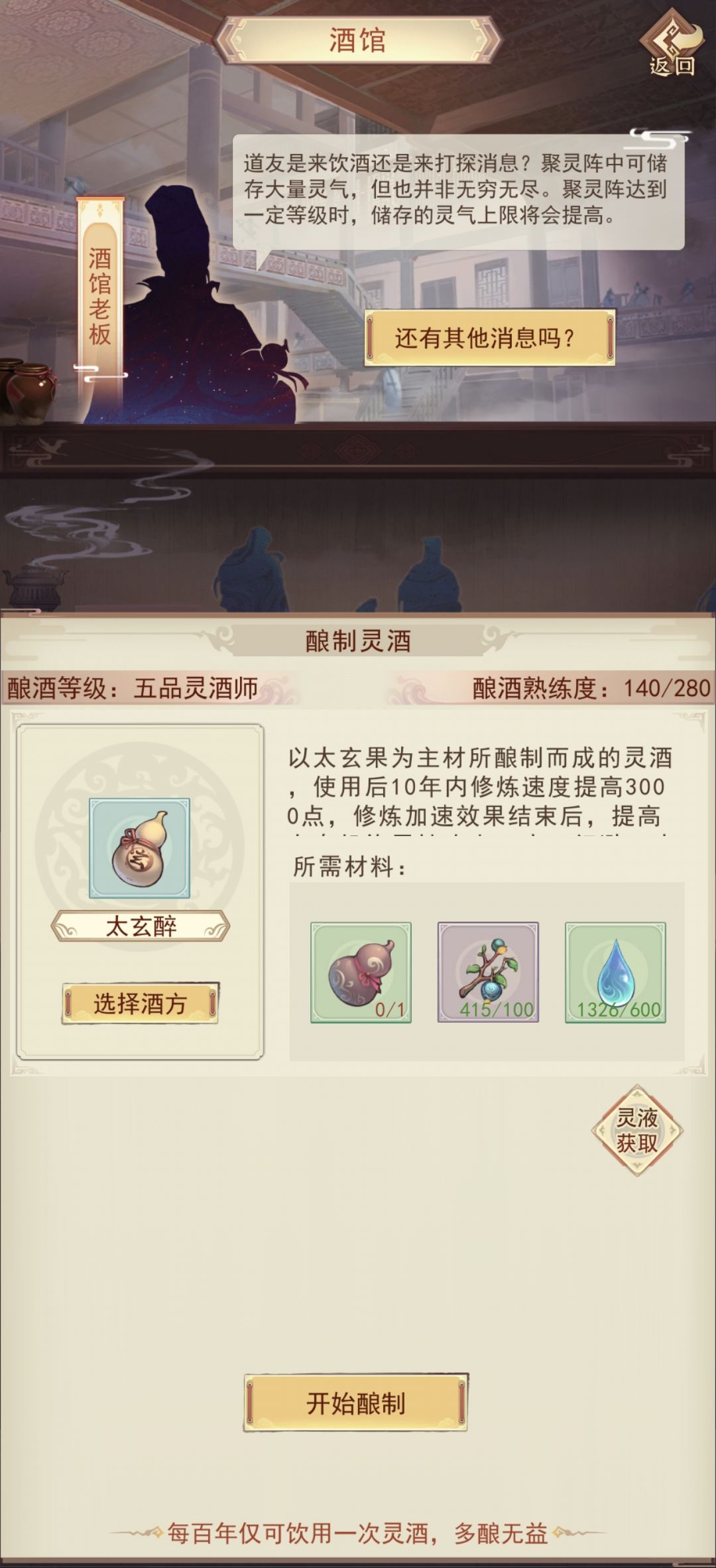 找酒馆老板可以买更多灵酒原浆