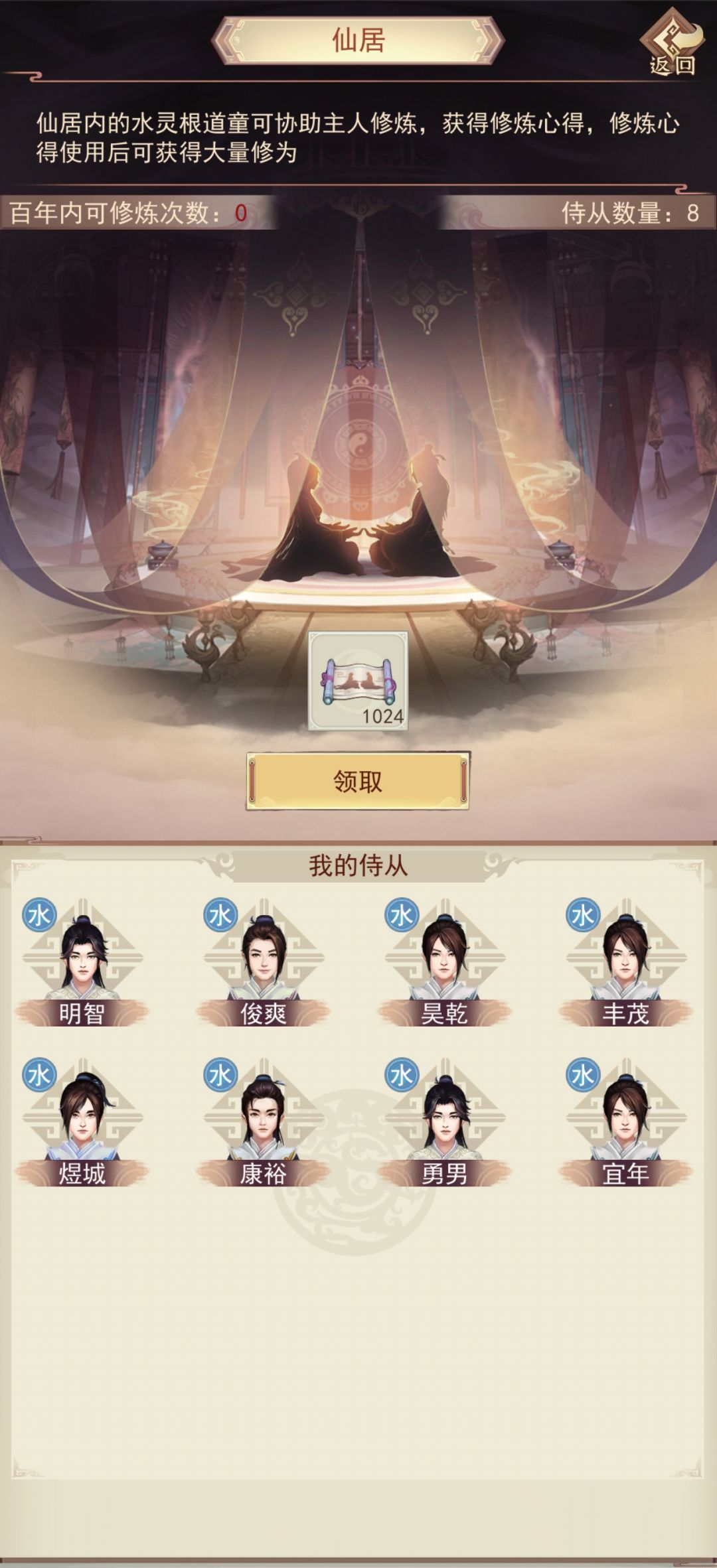 打完6功德就继续升心法,如果洞府水道童已超8个,可以不使用草铁攒着升7级道童居。