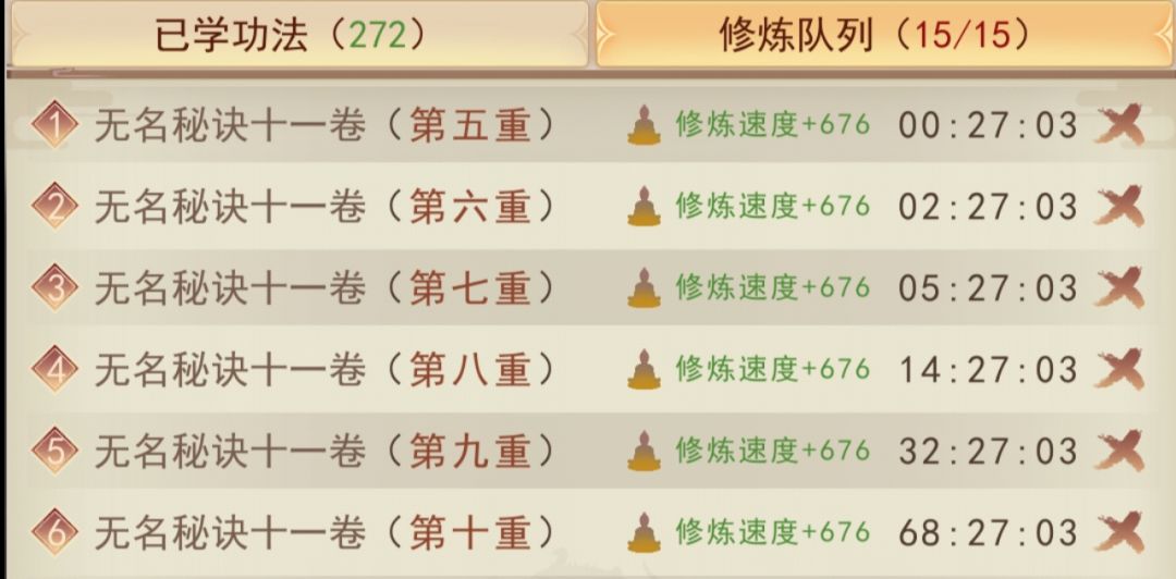 功法升级上,心法在进仙宗前拉到1星5,2星6,345星7重。