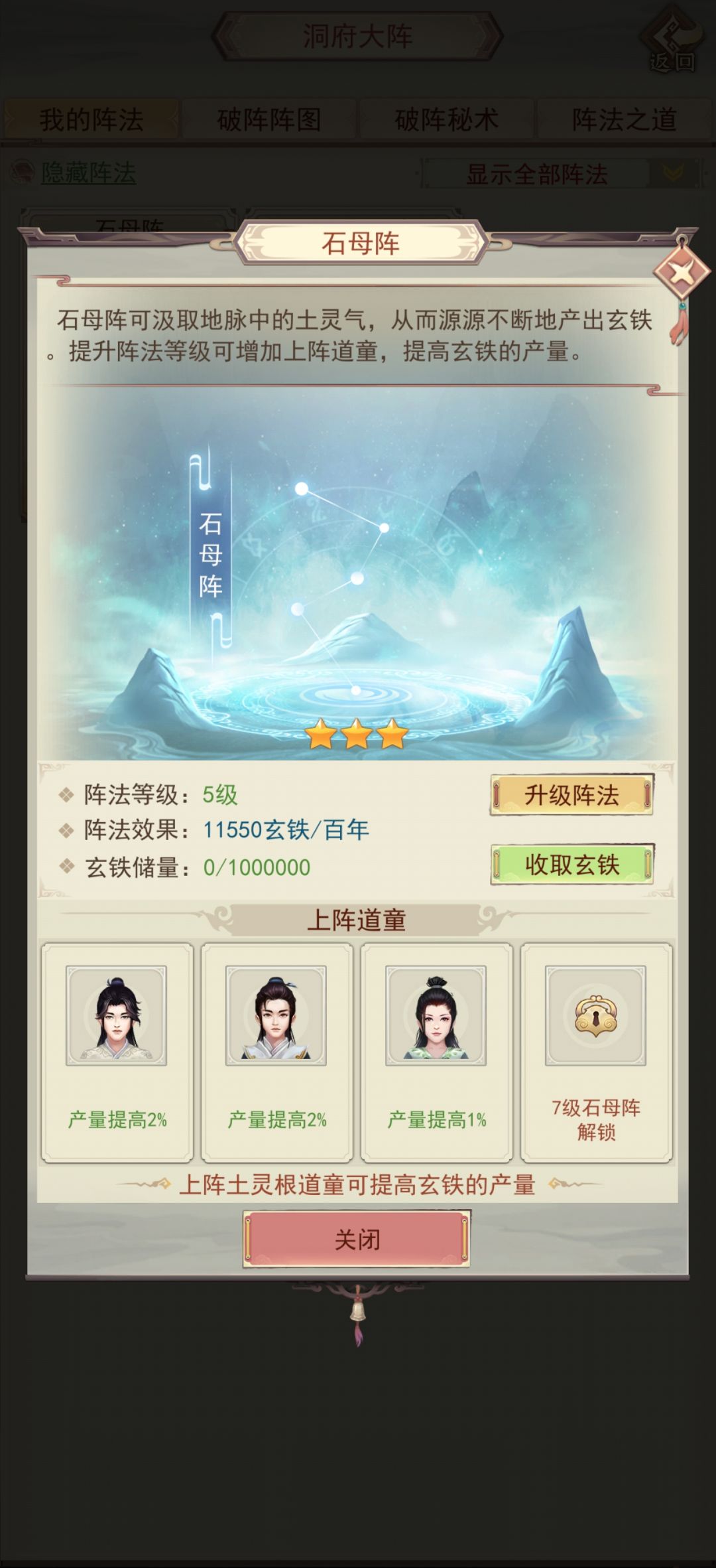 学习阵法后洞府开石母阵,升到5级即可,每天1万+灵石产出。