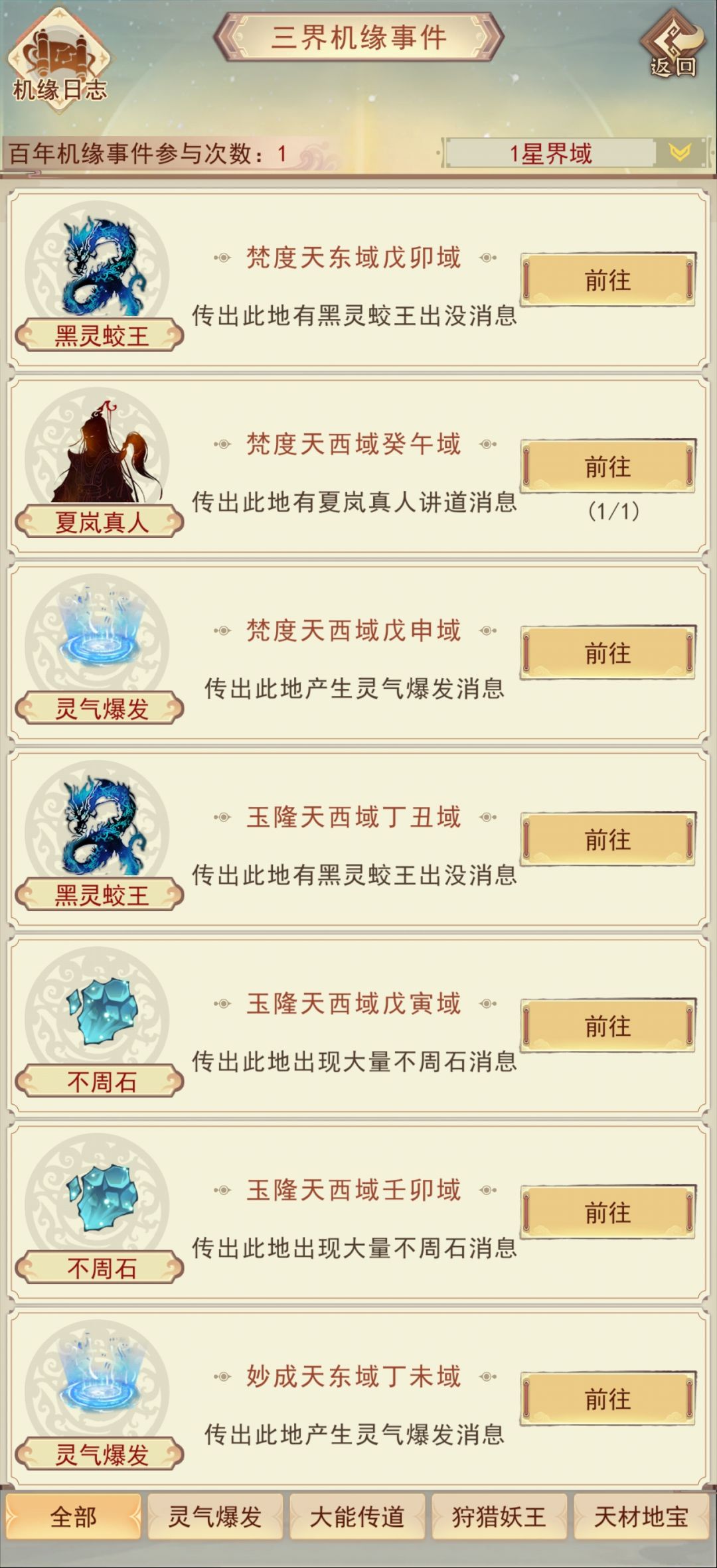 每个地图四域总游历第21次时探索出现,优先参加攻防血类,但在洞虚进仙宗前先不修炼,而是攒灵石去仙宗开灵识点抽功法。