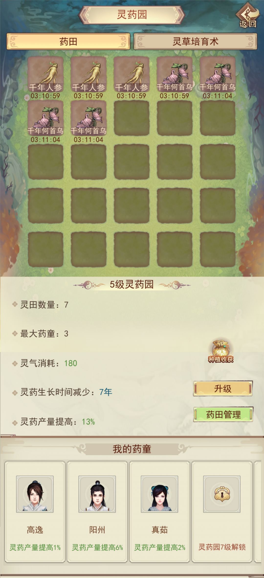 灵草园典籍继续领悟,领悟完就可以药园开种植了,开7块地后主要种植人参何首乌。